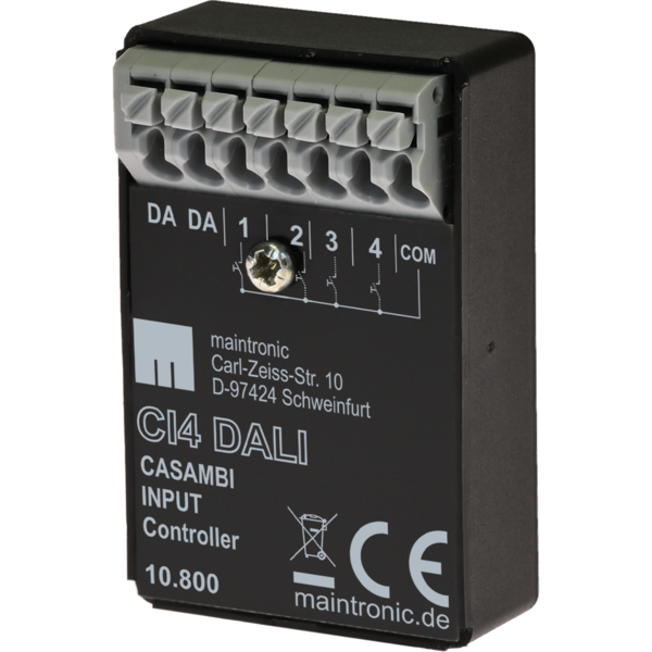 Deze controller heeft 4 potentiaalvrije ingangen die kunnen worden aangesloten op een DALI-circuit of op een Casambi-netwerk. Zo kan DALI bedrijfsapparatuur draadloos worden bediend via Casambi.