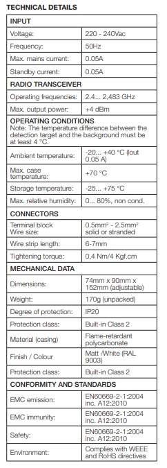 Registreert zowel beweging als lichtsterkte. Bereik circa 25m, IP20, voeding 220-240 VAC. Montage in combinatie met CBU-CESO!