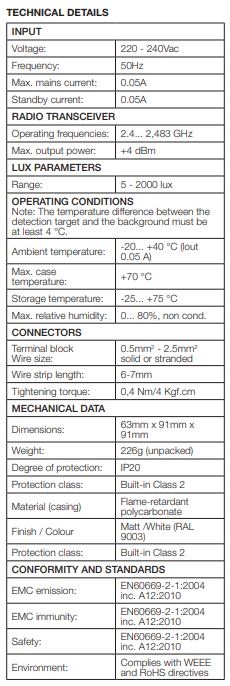 Voeding 220-240 VAC, IP20, bereik to diam. 28m bij een montagehoogte van 14 m.