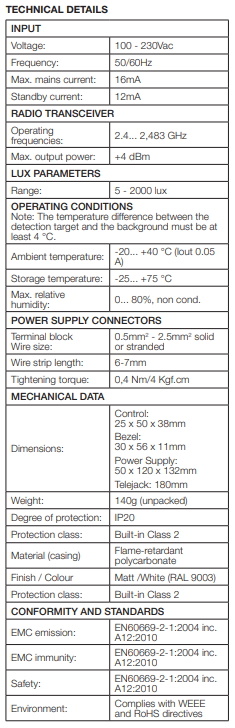 Externe voeding 220-240 VAC IP20 bereik to diam. 7m bij een montagehoogte van maximaal 5 m.